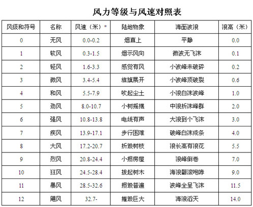 施工單位應根據地區氣象部門的觀測數據,(施工單位應自備簡易溫濕度測定儀),在混凝土施工當天的外界最高溫度,最低相對濕度,最大風速,從附表中查出水分蒸發量,如果超過0.6kg/m3/h時,可以推定混凝土產生塑性開裂的可能性很大,必須采取措施進行預防。應注意,當水分蒸發量超過上述值時,只要混凝土澆筑到模板內,不管在什么時間,都有可能出現開裂,應防止有人認為的“開裂應在混凝土硬化后才出現”的觀點,隨時根據天氣情況采取技術措施。對表中溫度、濕度的數值,宜按當時具體情況予以實際測量,風速可采用附表的《風力等級與風速對照表》進行判斷,同時,應注意具體施工位置是否在山上、風口或高層,這些位置的風速與地面風速有較大差距,而預報風速一般是指地面風速。應以判斷出的現象進行查表確定風速。