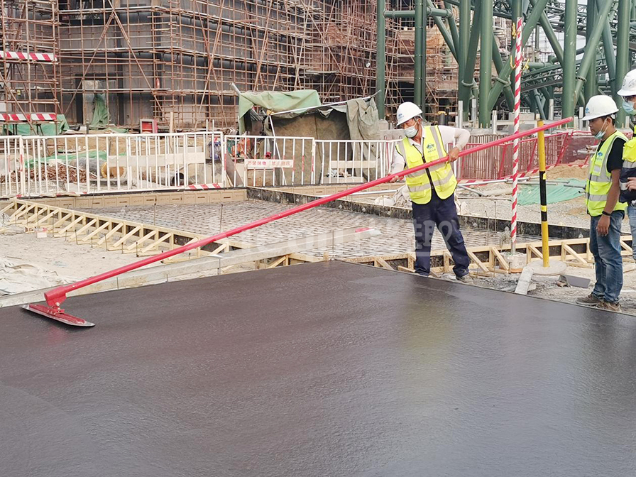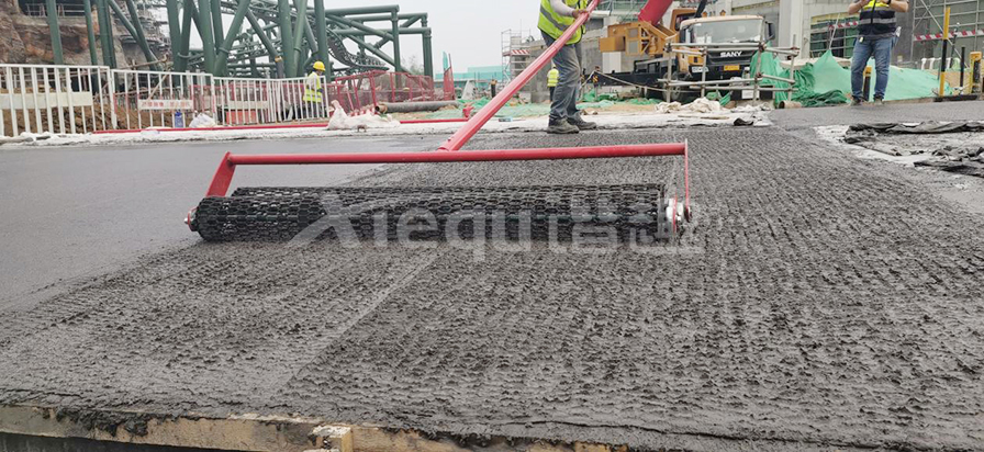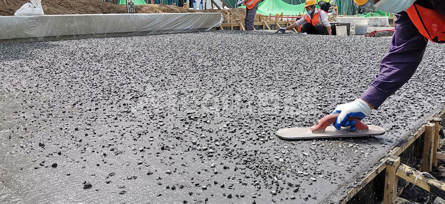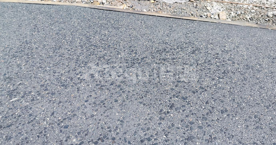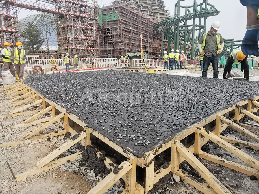 礫石聚合物藝術地面是在通體彩色混凝土初凝前合適的時機按照一定的比例要求將特殊骨料均勻的拋灑于彩混面層,再將骨料拍入面層后進行收光,最后在面層均勻噴灑鈍化劑薄膜覆蓋,待混凝土固化到一定程度對表面進行清洗露出骨料原貌的一種裝飾做法。